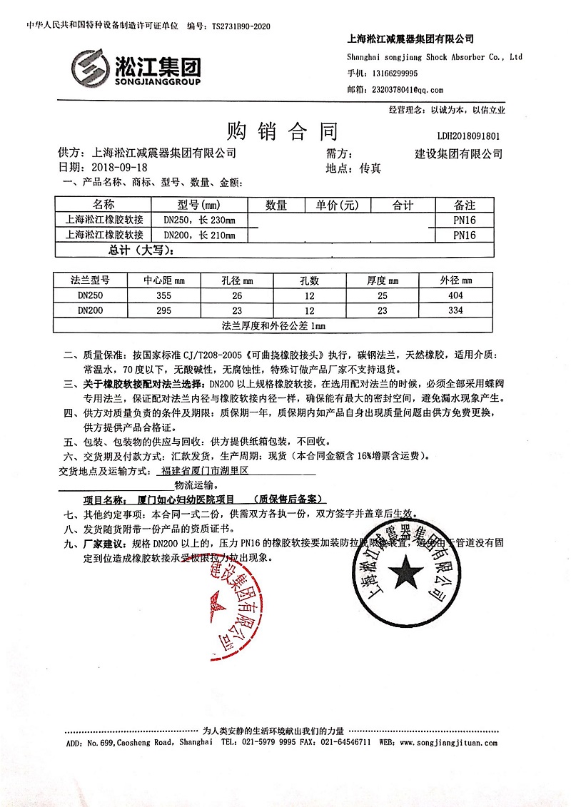 淞江集团企业官网介绍:厦门如心妇幼医院项目配套橡胶接头合同信息,淞江集团橡胶接头上海制造基地为全国建设工程以及给排水项目提供发货橡胶接头,橡胶软连接,橡胶减震器产品,下面是厦门如心妇幼医院项目配套的橡胶接头产品介绍。